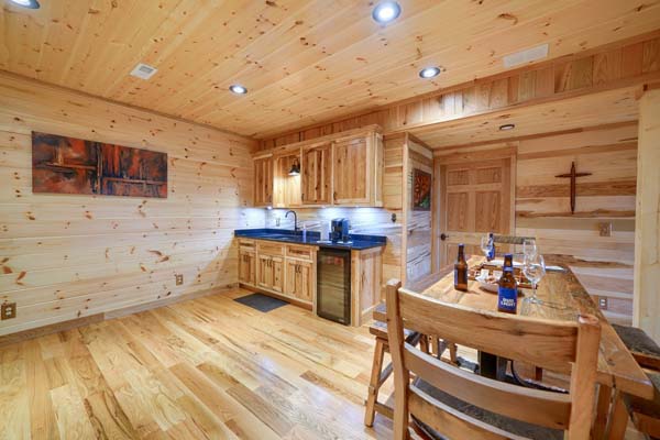 Home away from home in the woods! This custom built Jubach log home is perfect for a family or couple's retreat. Sleeps up to 6 guests comfortably with 2 private bedrooms, one king, one queen, 1 loft bedroom suite with queen. 3.5 baths with one shower/tub combo, and remaining two with showers. Master suite located on the first floor along with full kitchen with gas stove, dining area, great room, utility room with washer and dryer and half bath. Stone gas log fireplace first floor, electric fireplace in finished lower level, and spacious outdoor fire pit with seating. Finished lower level has shuffle board table and wet bar with mini refrigerator and pub table. Private hot tub on covered lower level deck. Complimentary WiFi and satellite TV.